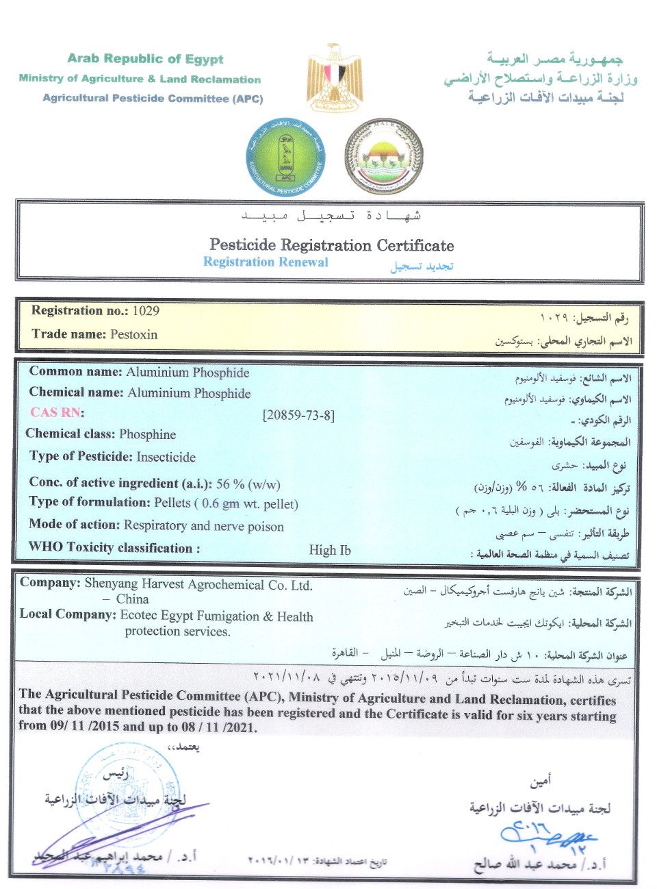 Ecotec Egypt is the sole agent of providing Aluminium phosphide gas "pestoxin" 56% pellets 0.6 gm and tablets 3gm bulk into different packages 1000gm , 300gm , 90gm for using against insects which infest the agriculture stored commodities, processed food and animal feeds.